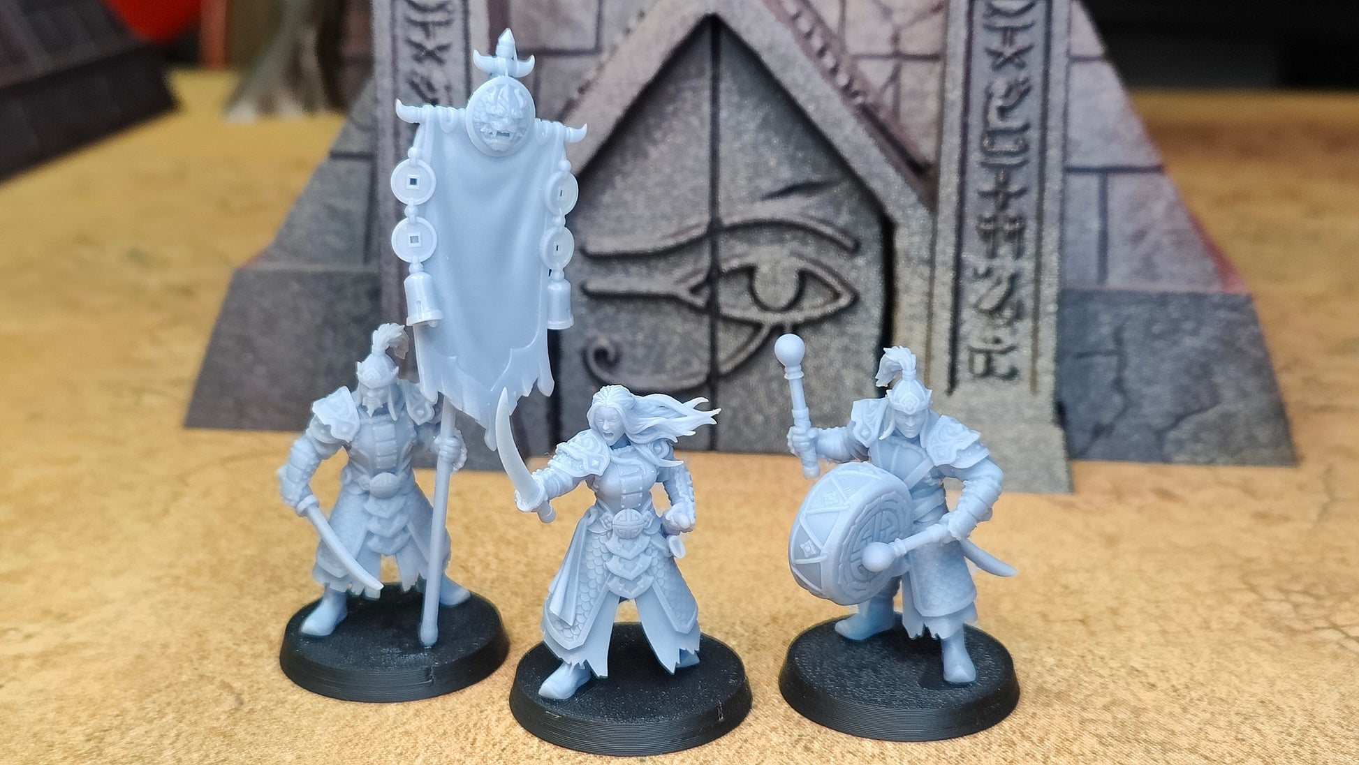 Tre modeller – Astarii Commander (kvinde med sværd), bannerbærer og trommeslager.
