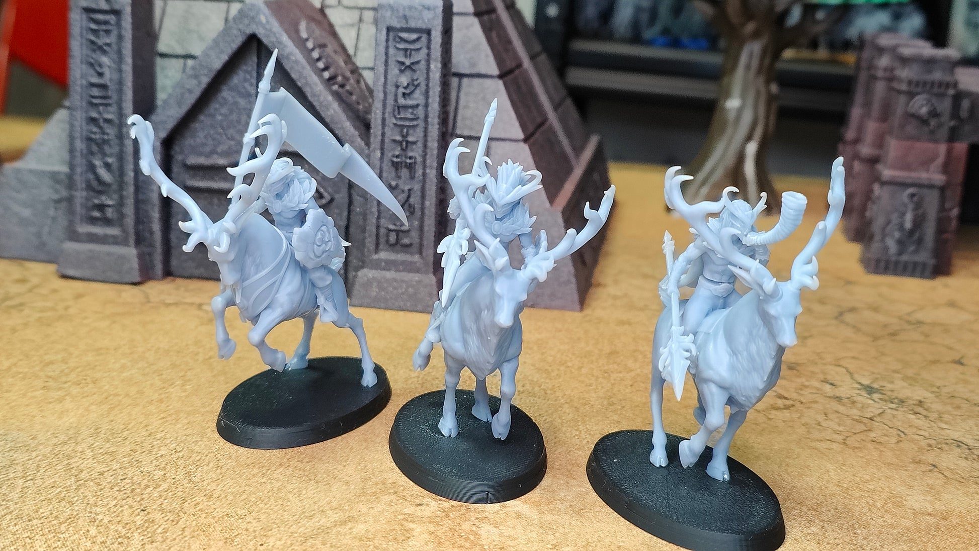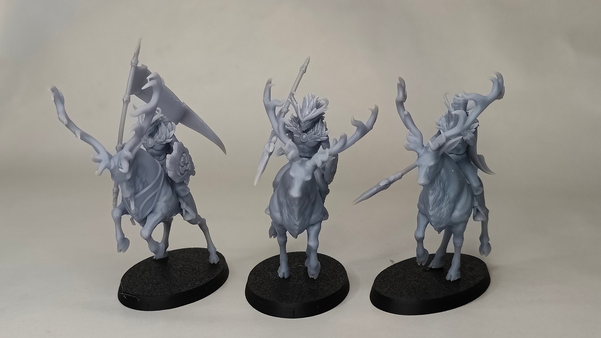 Tre modeller – spydbærer, fanebærer og hornblæser, alle ridende på hjorte med store gevirer.