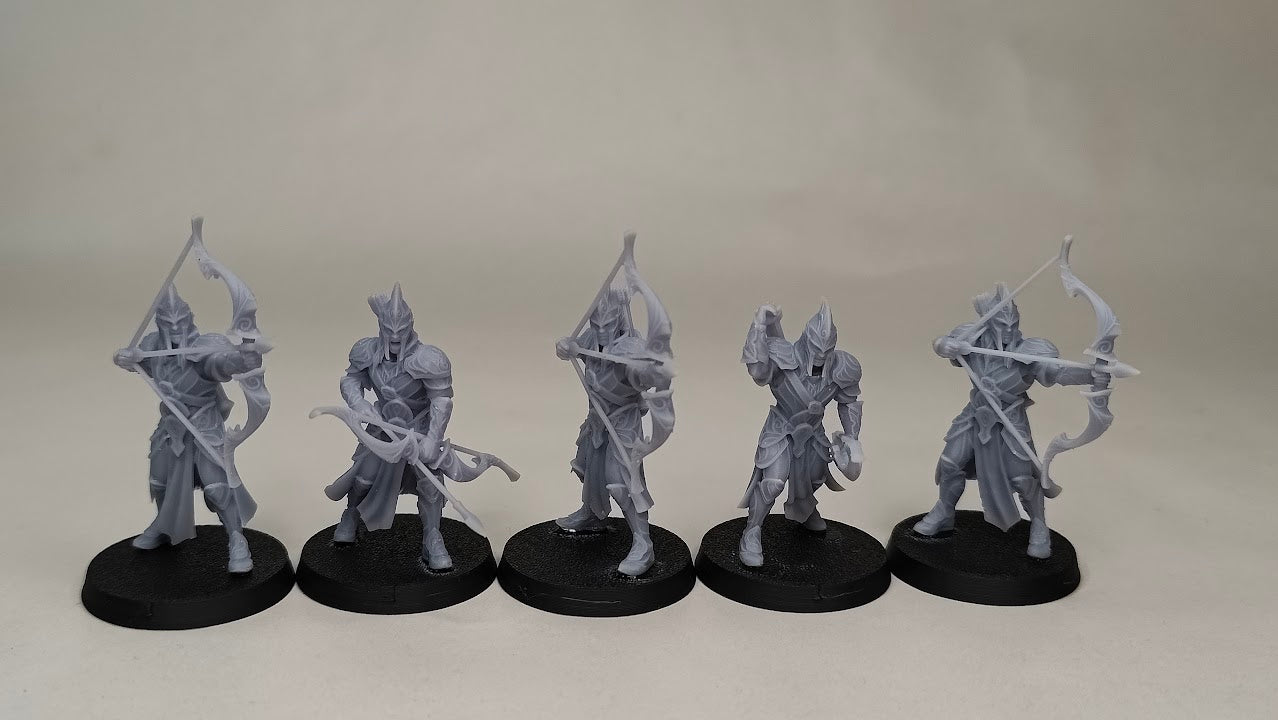 De fem modeller fremstår imponerende i deres detaljerige panser, dekoreret med indlagte mønstre og skarpe kantlinjer, der giver dem et aristokratisk, men farligt udtryk. Buernes buede arme er forstærket og ornamenteret, og krigernes positurer viser både styrke og ubønhørlig præcision. De er ikke blot skytter – de er højelvernes stormvåben på afstand.