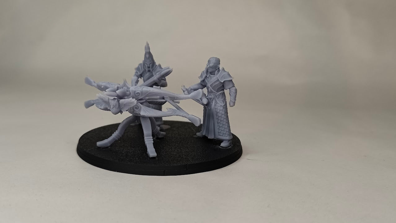 Modellen viser en elegant baliste, forstærket med slanke metalbuer, udskårne linjer og indlagte ædelstenselementer. To elvere betjener våbnet: den ene sigter med koncentreret præcision, mens den anden styrer mekanismen med rutinerede bevægelser. Begge er klædt i let, men detaljeret rustning, der matcher Silvermoors ikoniske æstetik. Resultatet er et våben, der både er smukt og dødeligt – højelvernes måde at kombinere kunst og krig.